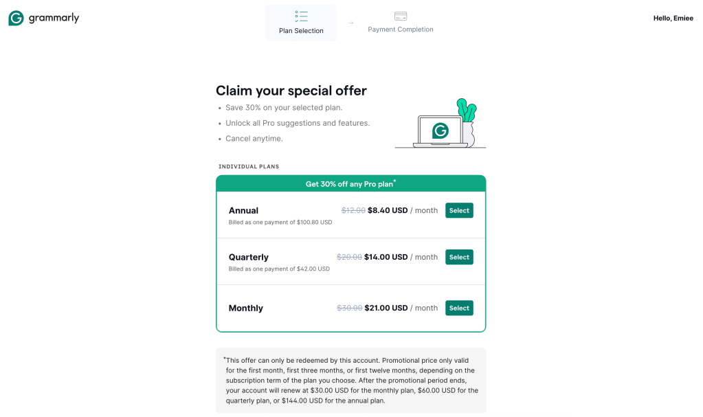 About the project: Grammarly’s Growth Marketing team collaborated with the Marketing team on several check-out flow optimization redesigns through the spring of 2025. One such initiative was focused on streamlining a discounted rate checkout triggered by a paid search ad link.